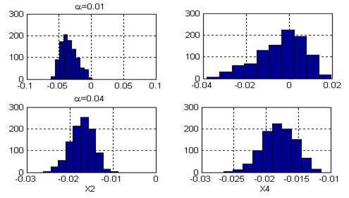 =0.04 radically changed the estimations: the distributions approached to the normal one, the dispersions decreased considerably and the mean values were shifted. Such a different behavior of the estimations