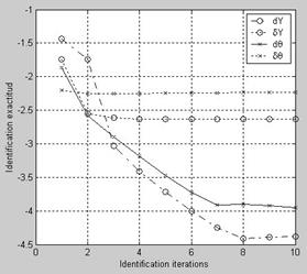 To determine the identification procedure parameters, let analyze Figure 2 where identification flow in the base conditions (excepting NI = 10) is demonstrated. Common logarithms of current iteration increments dYi, dΘi and current accuracies δY*I, δΘi are plotted here versus iteration number variable. It may be noted that more and more short steps follow after the largest first one, and the increments are stabilized to the iterations 7-8, but accuracy stabilization is reached already on the iterations 2-3. Due to a flatness of the curves dY and dΘ in the right part of the plot, besides the increment limitation, an iteration number boundary was also introduced for loop termination and the value NI = 3 is accepted as basic.