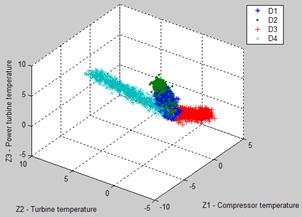 With three described above schemes of noise representation, three corresponding fault classifications have been formed for the analyzed power plant. Namely, three variations of the learning and validation sets were created. Each classification includes 9 classes and each class is simulated by the gradual change of the corresponding fault parameter in the thermodynamic model. Four such classes are shown in Fig.5 in the space of three normalized deviations. The deviation errors correspond to scheme A.