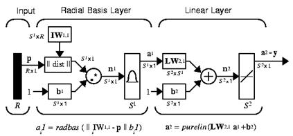 Figure 2 helps to illustrate RBFs’ operation. The presented radial basis network includes two layers: a hidden radial basis layer (S1 nodes) and an output linear layer (S2 nodes). The input vector