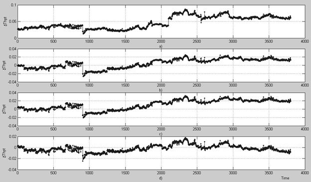 in the form of time plots for the mentioned four cases. The following can be stated after the plot analysis. 1) The trends provoked by the fouling and the cleaning-induced shifts are well distinguishable. The deviation quality (signal-to-noise ratio) is lower in the right part of the plots. Some causes of the disturbances - in particular, measurement latent defects that are not distinguishable by common filtration methods - have been determined in our papers [10,11]. The factors that influence the engine but are not taken into account in the model yet - for example, air humidity – can also affect the deviations. 2) The modified procedure is not worse than the original one by the deviation quality (compare plots “b” and “c” of Fig.1). 3) The deviations computed relatively the model with time variable (see plot “d”) should contain only random fluctuations if the model is adequate to registered data. However, it can be concluded that the deviation still contain remaining effects of the fouling and clearing.
