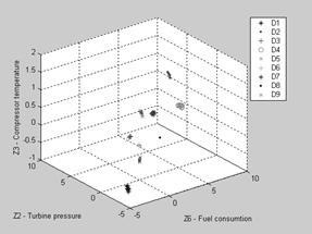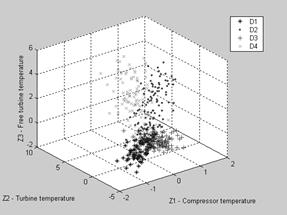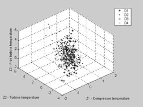 In first gas turbine health monitoring systems, any use of complex statistical recognition methods was too expensive in time and computer capacity. Therefore it was often decided to reduce processing requirements by a diagnostic techniques simplification. For example, Saravanamuttoo and MacIsaac [8] proposed the diagnosing by fault matrices where every class (fault signature) is presented by residual’s signs only. Other example of a simplified technique can be found in the paper by Pipe [5]. To reduce processing requirements, the author minimizes an axis set of the class’s recognition space. Both mentioned simplifications mean losses of available information that always provoke recognition errors and our statistical simulations of diagnosing process have shown [see 11] that these errors are great.